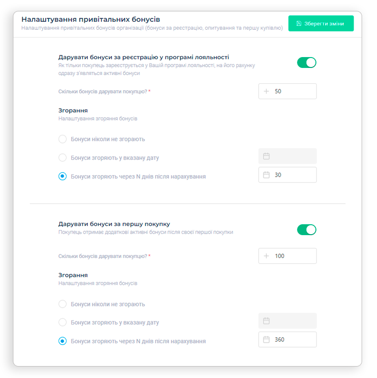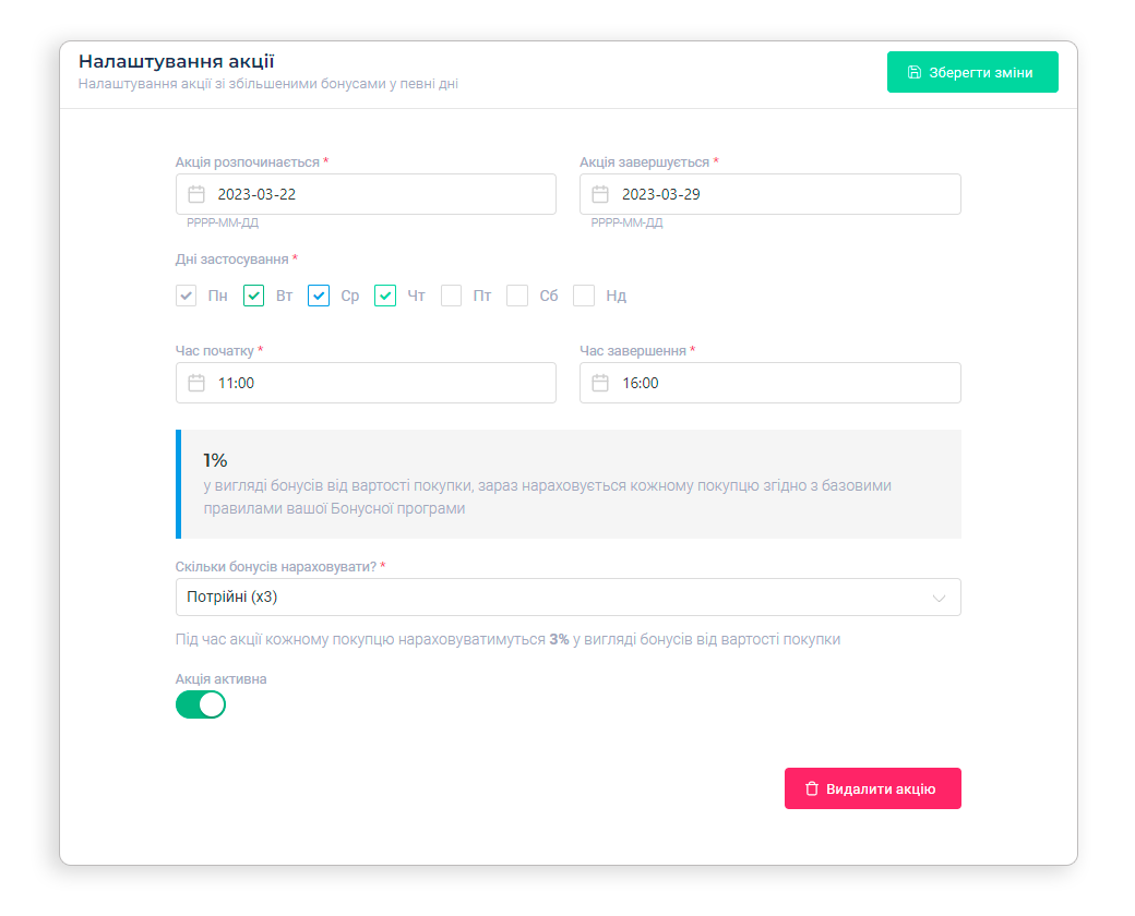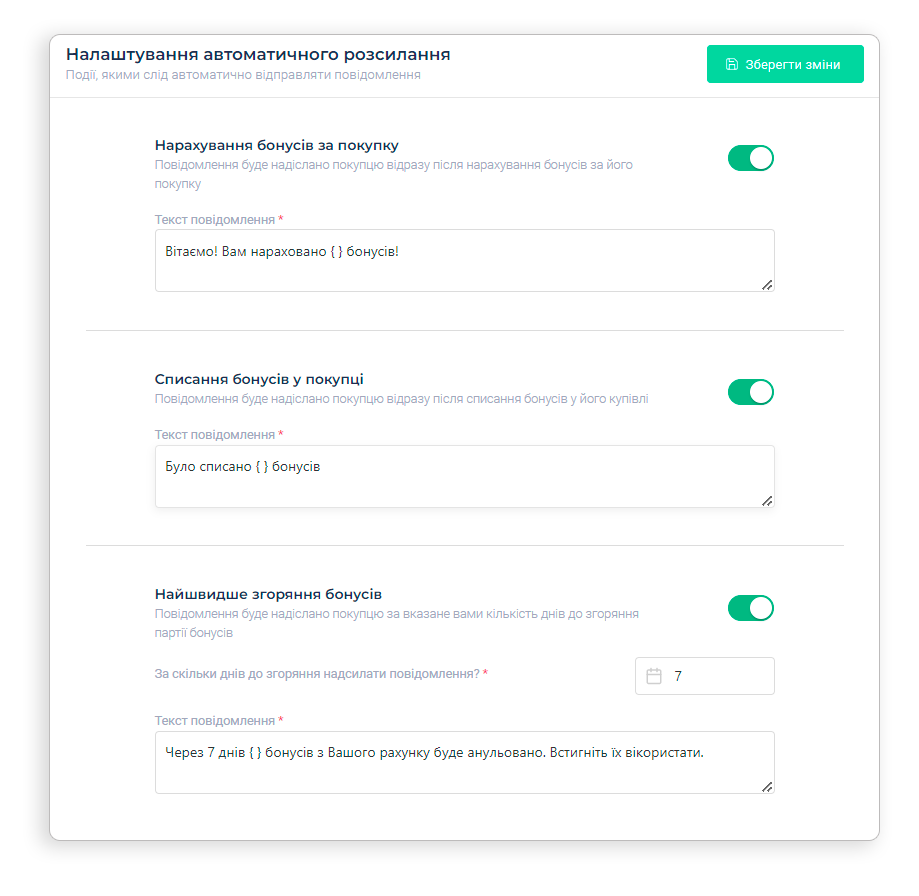 На приклад, щоб програма відправила повідомлення типу “Вітаю, за Вашу покупку Вам було нараховано 20 бонусів” Потрібно у відповідне поле написати “Вітаю, за Вашу покупку Вам було нараховано { } бонусів”.