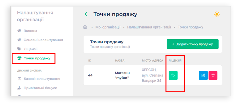 У цьому ж розділі “Точки продаж”, привяжіть до кожної Точки одну з Ліцензій.