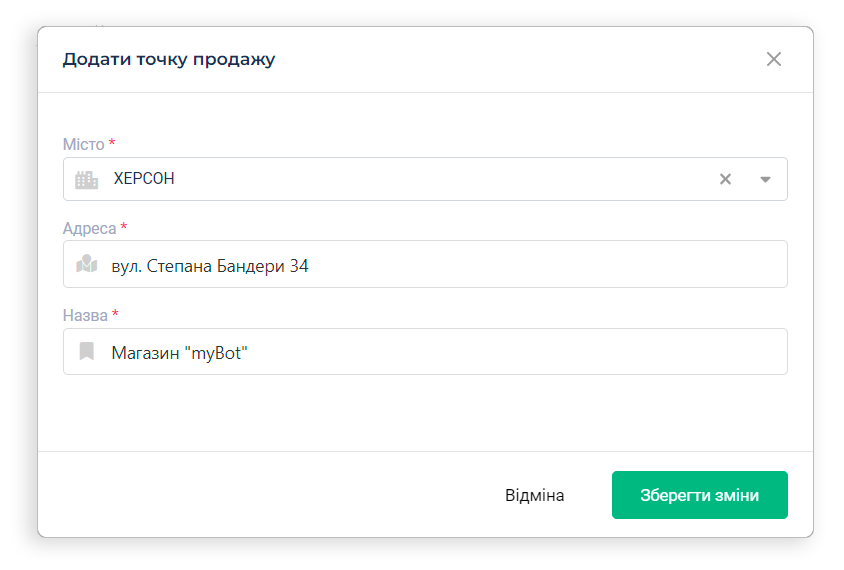 Створіть та додайте всі Ваші точки продаж, на яких Ви хочете запустити програму лояльності. Всі поля є обов'язковими